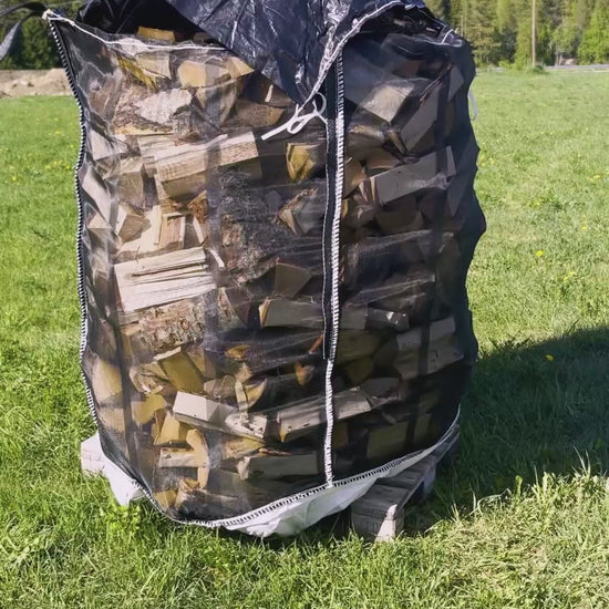 Säckarna är väldigt bra ventilerade från alla sidor så att den färska veden torkar snabbt under förvaringen och färdiglastade säckar med torr ved är lätta att transportera.